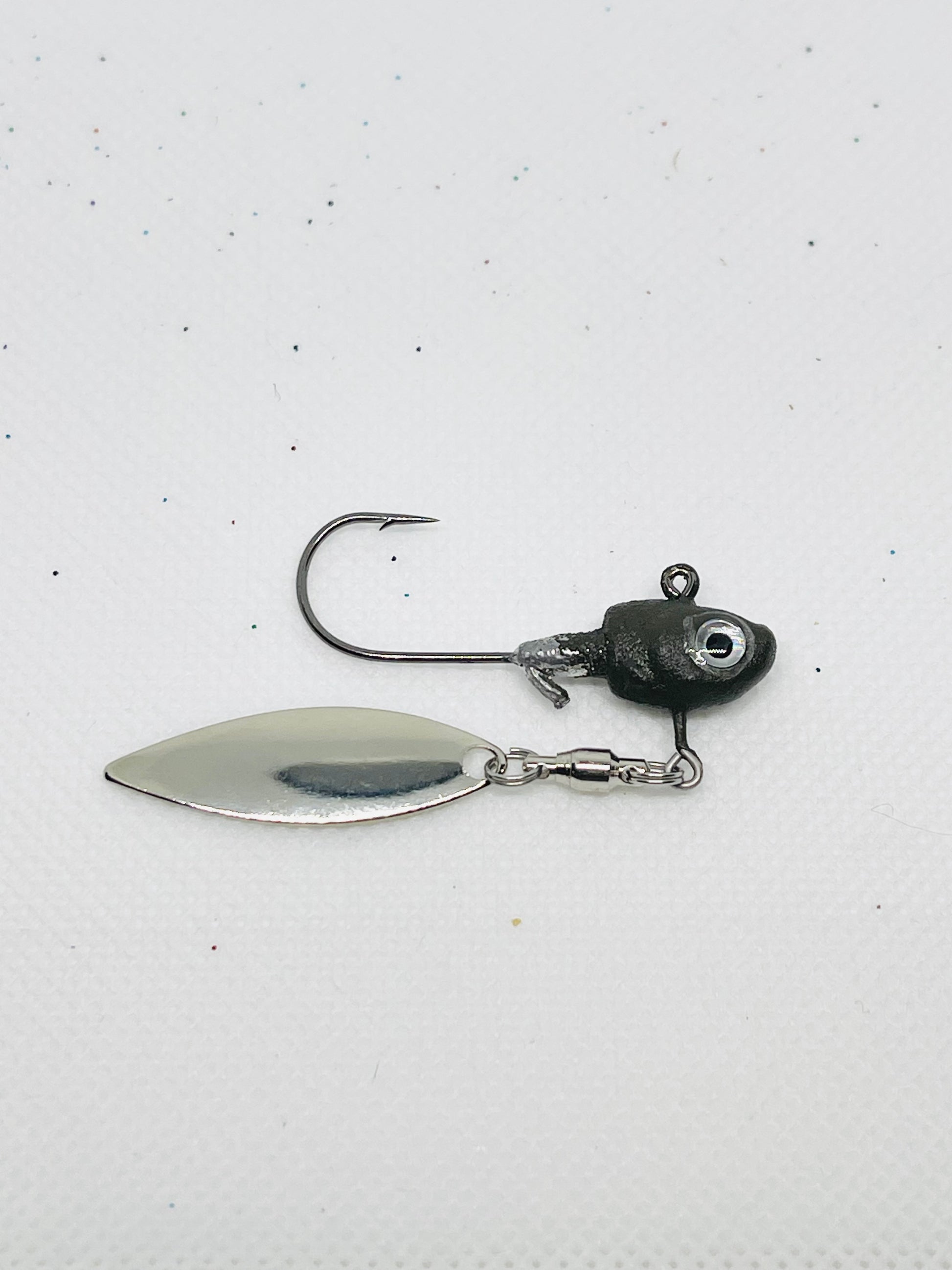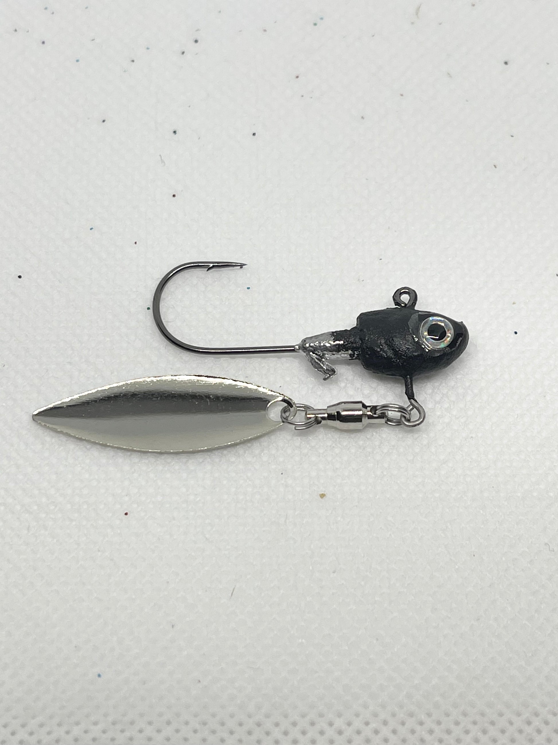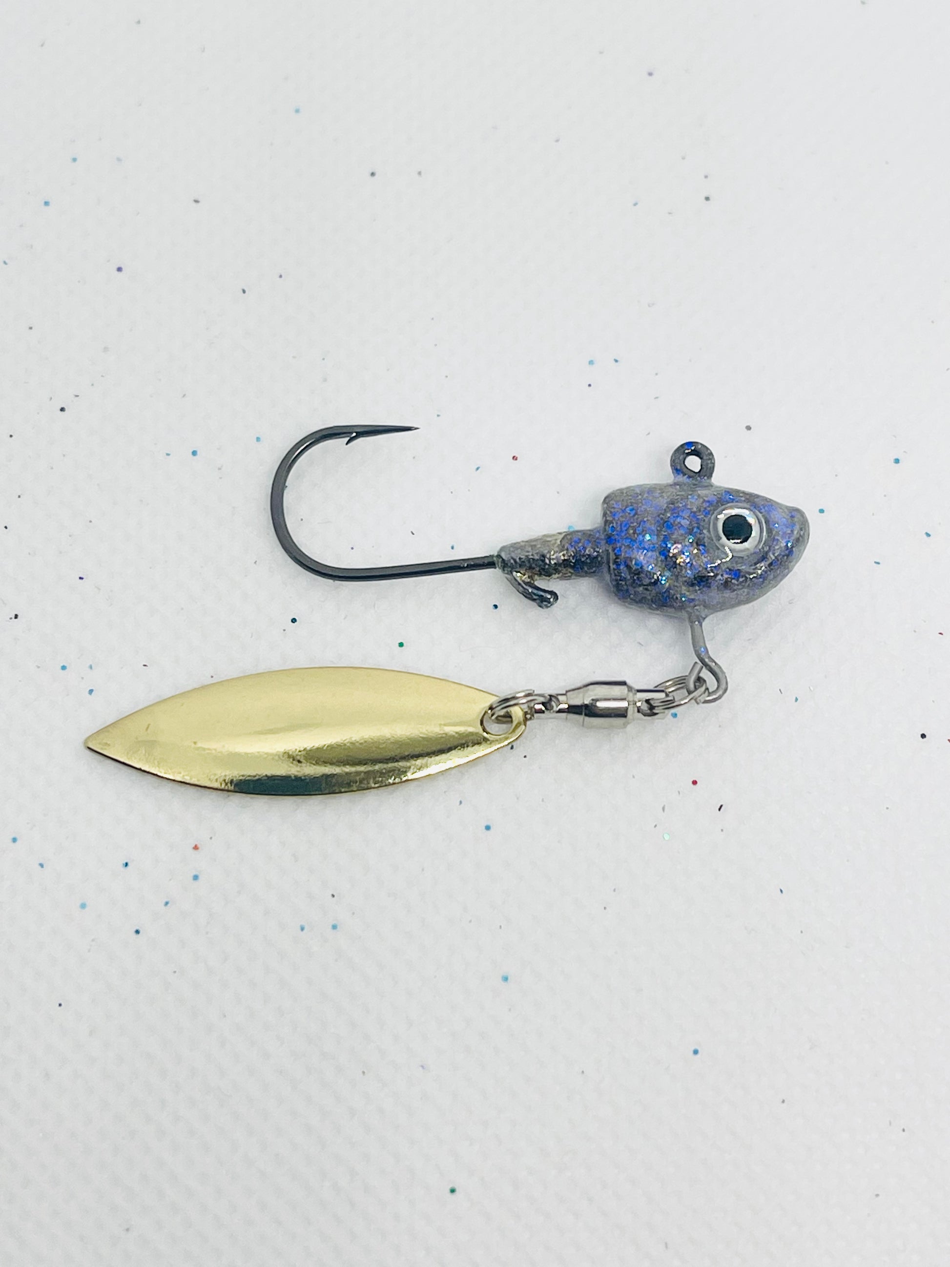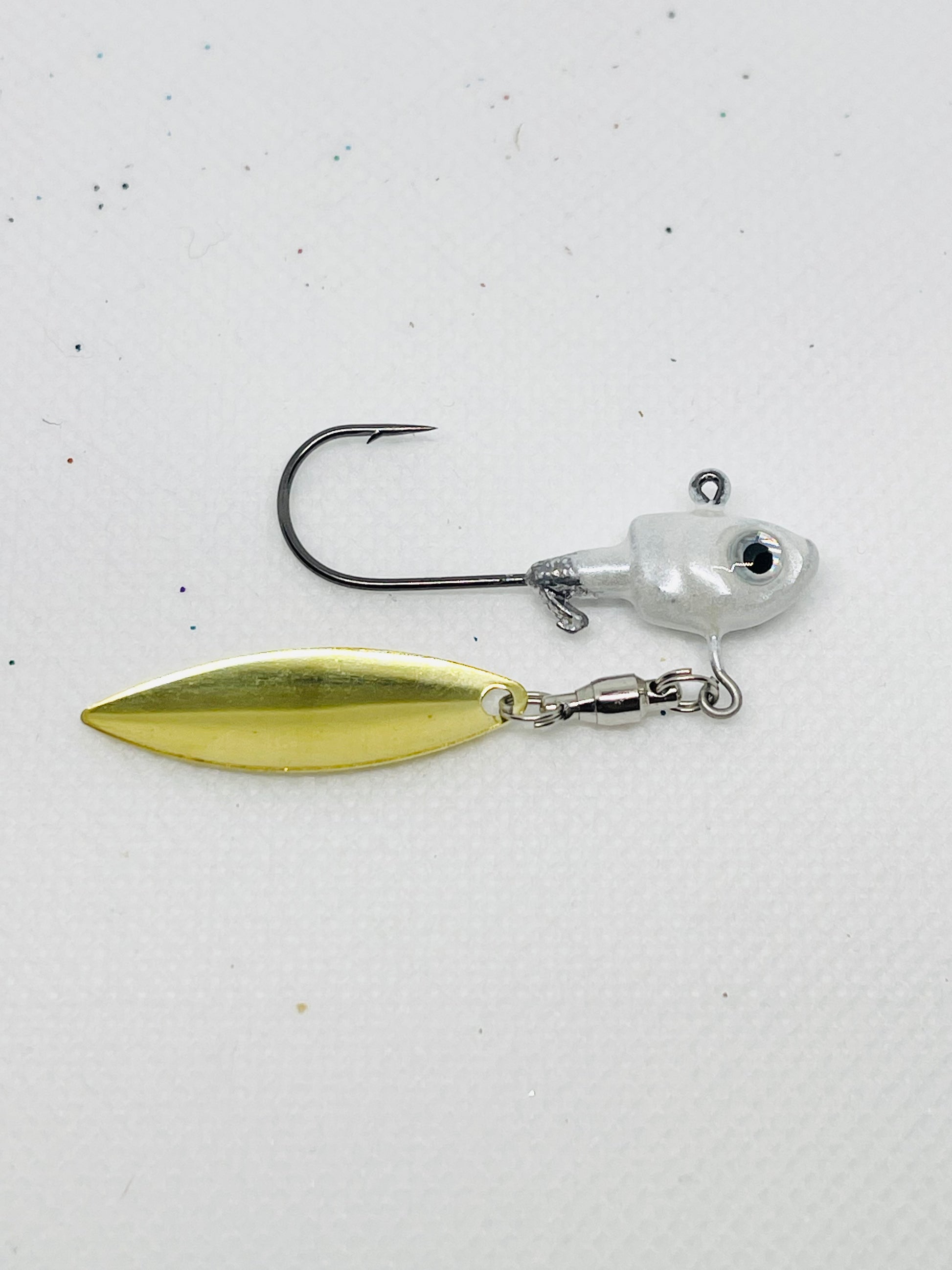 Built around a premium 1/0 Mustad Ultrapoint hook, the Juicy Jigs Mini Underspin features lifelike 3D eyes and a stainless steel barrel swivel that allows the polished brass and nickel plated willow blades to spin at even the slowest retrieval speeds. This delicate but deadly combination of finesse and flash combined with an affordable price tag make this jig a must-have addition to every anglers tackle box.